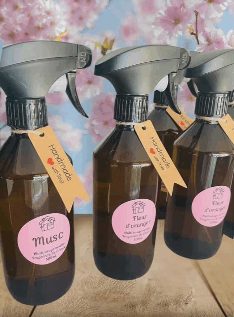 - Sprays d’ambiance, poudres (pour aspirateur), nettoyants multi-usages au savon de Marseille, suspensions parfumées (coeur, animal, etc.).